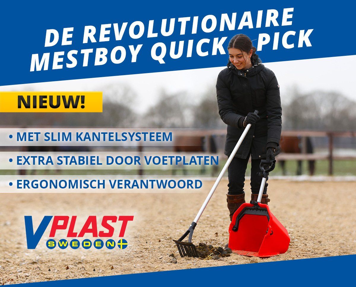 De Mestboy Quick Pick is de meest innovatieve in zijn soort. De voetplaten zorgen voor optimale stabiliteit. Met de mestvork kan de mest eenvoudig in de bak worden geschoven. Het slimme kantelsysteem verdubbelt de capaciteit en voorkomt dat de mest er onderweg uit valt. De lengte van het handvat maakt bukken tijdens het optillen overbodig. De Mestboy Quick Pick is eenvoudig te legen door de handgreep aan de onderzijde.