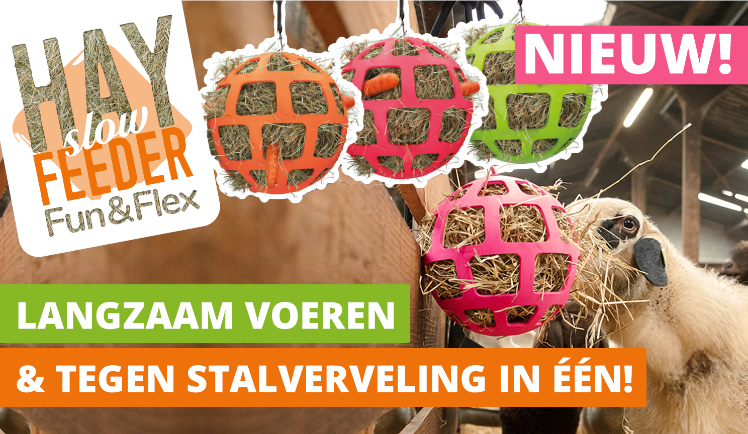 Hang de Hay Slowfeeder snel en eenvoudig op aan het meegeleverde soft halstertouw.