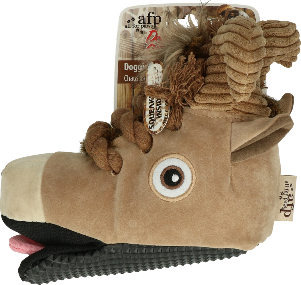 Eindelijk een schoen waar uw hond wel mee spelen mag! Gemaakt van heerlijk zachte badstof aan de binnenzijde en een iets ruwe onderzijde om dit speeltje nog realistischer te maken. Dit speeltje is tevens voorzien van een squeaker (pieper) voor extra speelplezier en katoenen flosstouw om het gebit te reinigen.