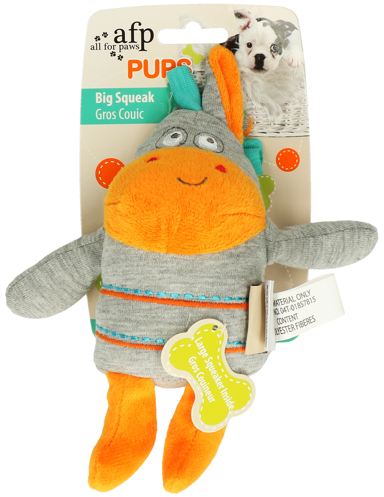 Speelgoed speciaal gemaakt voor puppy’s. Heerlijk om mee te knuffelen d.m.v. zacht jersey i.c.m. plush. Dit speeltje is voorzien van een grote squeaker (pieper) voor extra speelplezier.