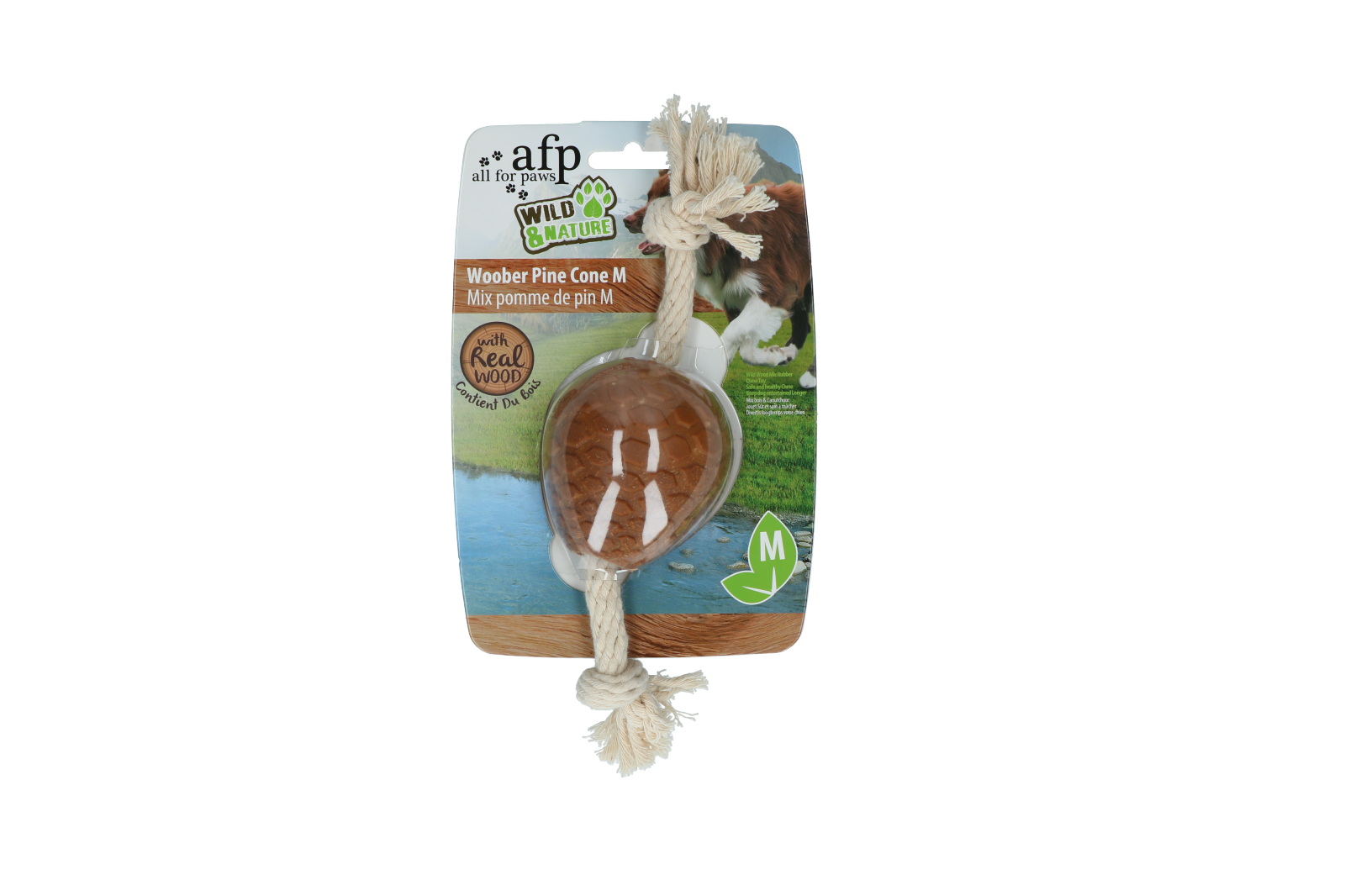 Deze dennenappel is gemaakt van rubber en hout. Het touw is van 100% katoen en deze combinatie maakt het speelgoed duurzaam en uitdagend.
