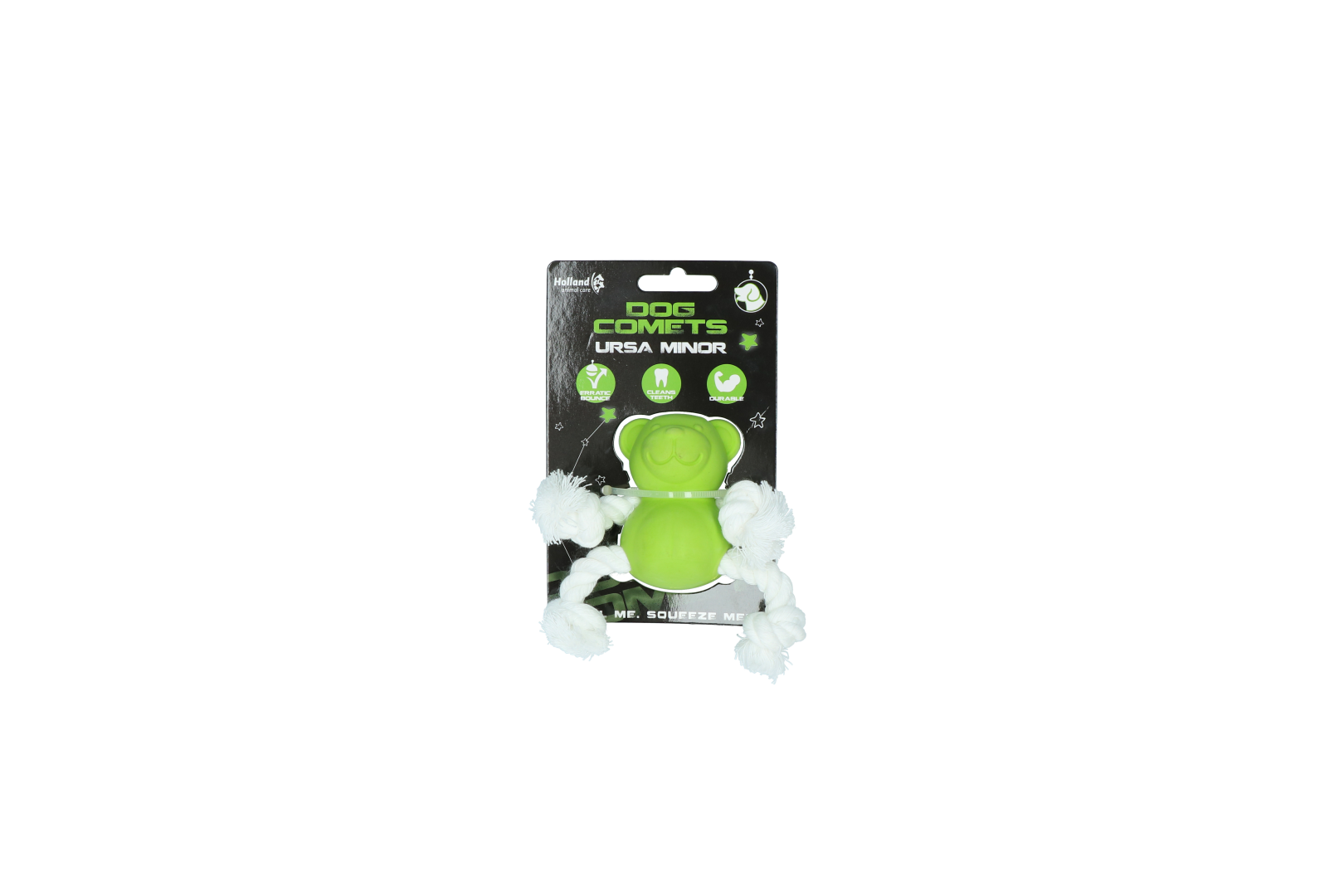 Deze vrolijk gekleurde beer stuitert alle kanten op en is super duurzaam. Het zachte touw masseert het tandvlees en helpt zo tanden en tandvlees schoon te houden.