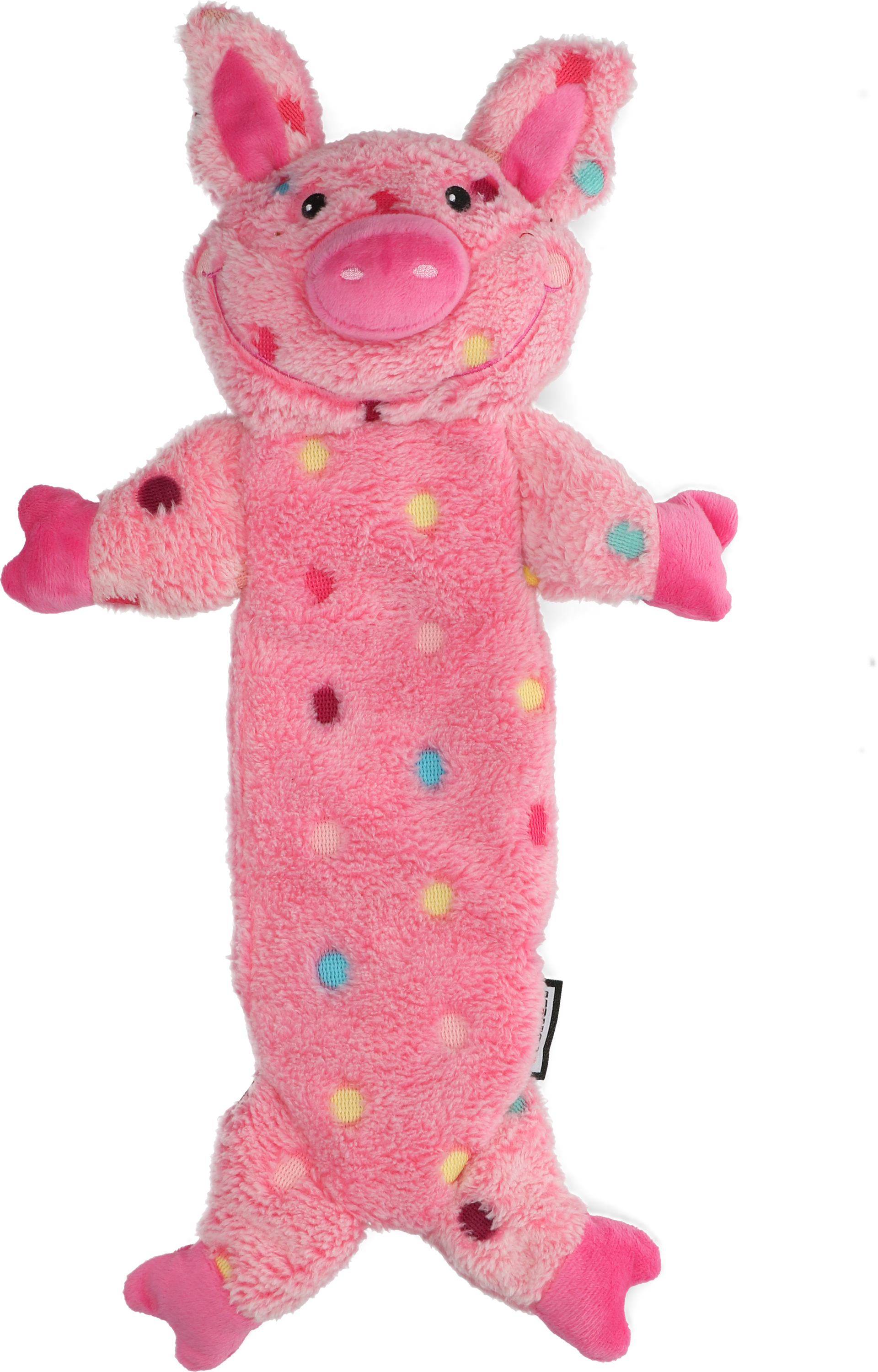 Deze knuffel heeft een lang en plat lichaam, zodat er extra hard mee geschud kan worden. Bevat een pieper en knisperfolie voor nog meer speelplezier. Extra gestikt voor een langere levensduur van deze knuffel.