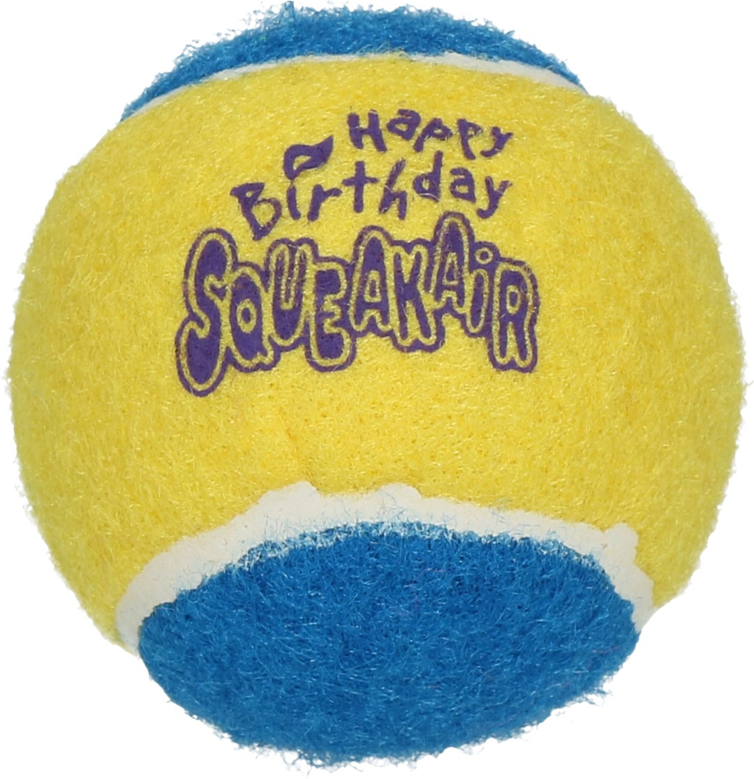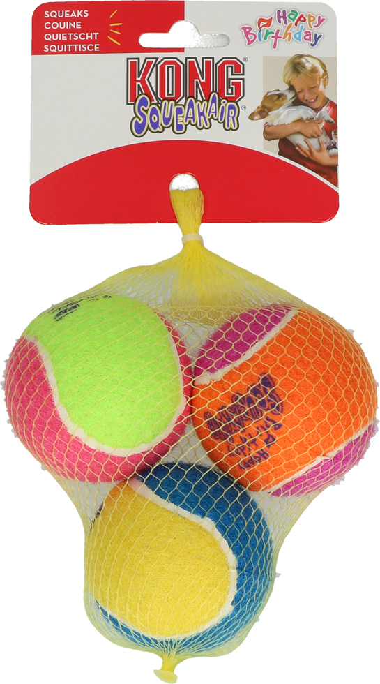 Deze leuke feestelijke verjaardags-tennisballen zijn voorzien van niet schurend materiaal zodat het gebit van uw hond niet wordt aangetast. Een combinatie twee klassieke hondenspeeltjes - de tennisbal en het piepspeeltje - en is daarmee het perfecte apporteerspeeltje. Door de felle kleuren krijgt het een feestelijk tintje. Gemaakt van speciaal, niet schurend vilt.
