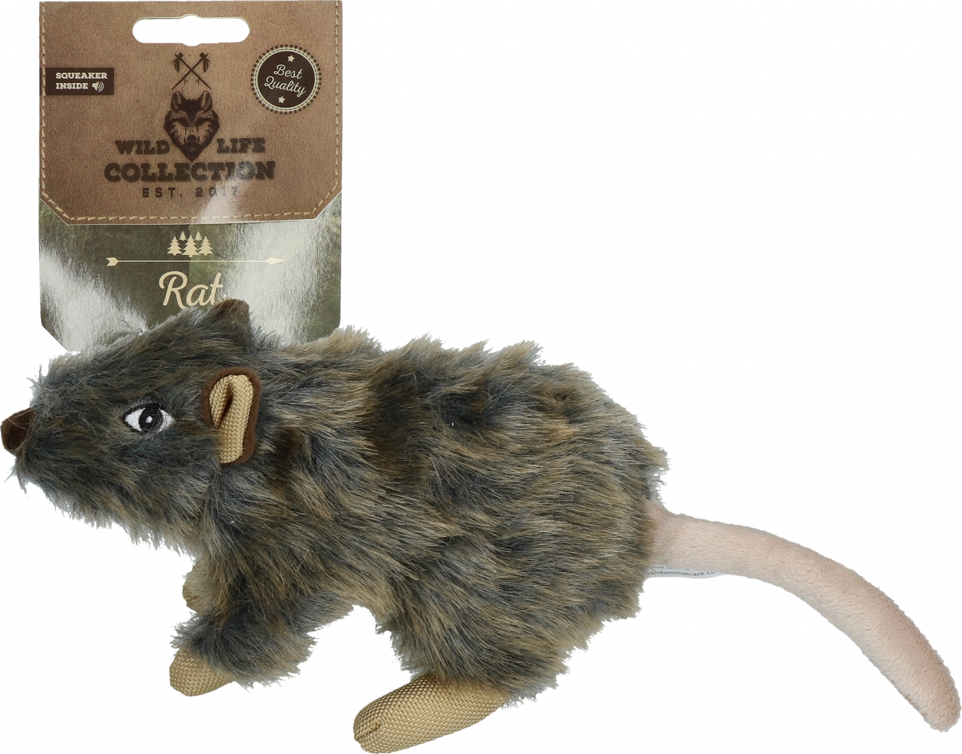 De Wild Life collection bestaat uit natuurgetrouwe pluche hondenspeeltjes. De vacht is gemaakt van zacht pluche en deze rat heeft een flostouw en een pieper.