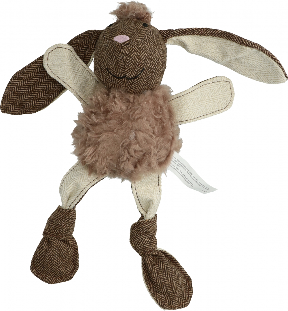 Dit knuffelkonijn is gemaakt van superzachte fleece en duurzaam en sterk canvas. Dubbel gestikt en met een pieper voor extra speelplezier. Met grote oren om mee te kunnen gooien en voor trek-spelletjes met uw hond. De benen zijn van geknoopt canvas en onderin de voeten zit nog een extra pieper.