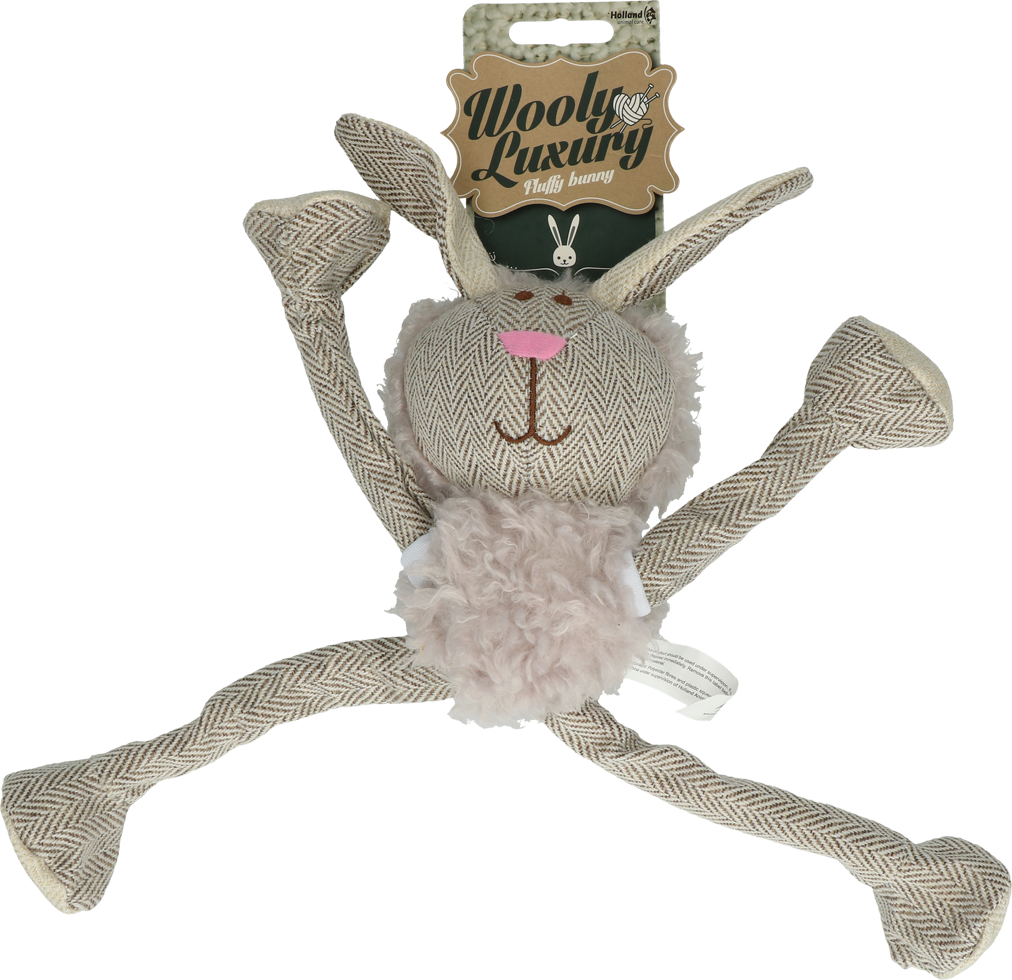Dit knuffelkonijn is gemaakt van superzachte fleece en duurzaam en sterk canvas. Dubbel gestikt en met een pieper voor extra speelplezier. Met extra lange armen en benen van canvas om mee te gooien en om trek-spelletjes mee te spelen. De armen en benen bevatten een flos-touw en kunnen langer en korter gemaakt worden.