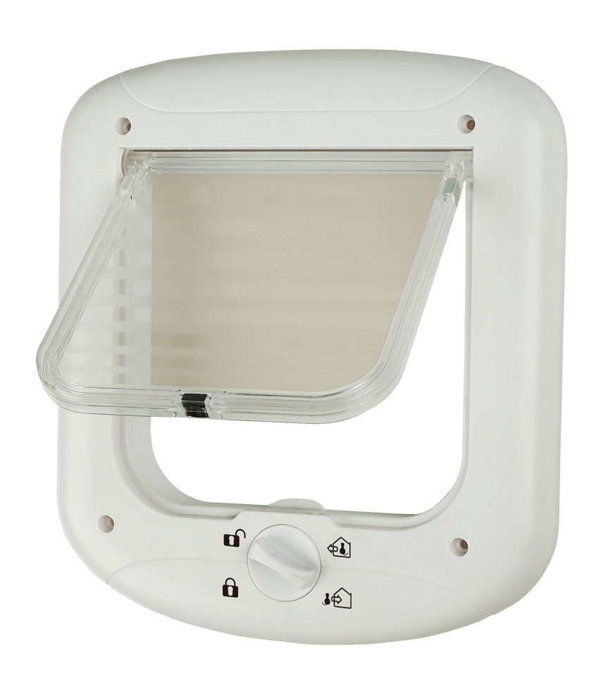 De Cat Flap heeft 4 standen, laat je kat uit, in, in of uit of doe het luikje op slot.