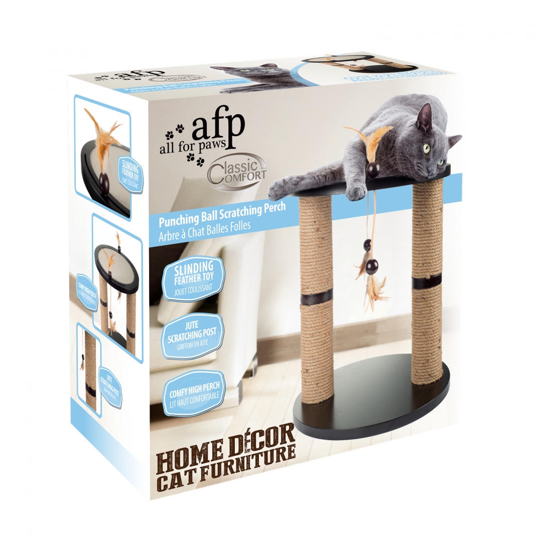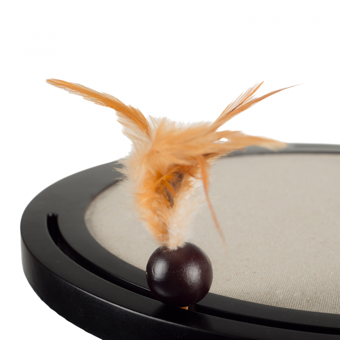 De bovenkant beschikt over een stof waar katten heerlijk op kunnen uitrusten. Om de krabpaal nog interessanter te maken voor uw kat is deze voorzien van 2 speeltjes met natuurlijke veren die heen en weer geschoven kunnen worden.