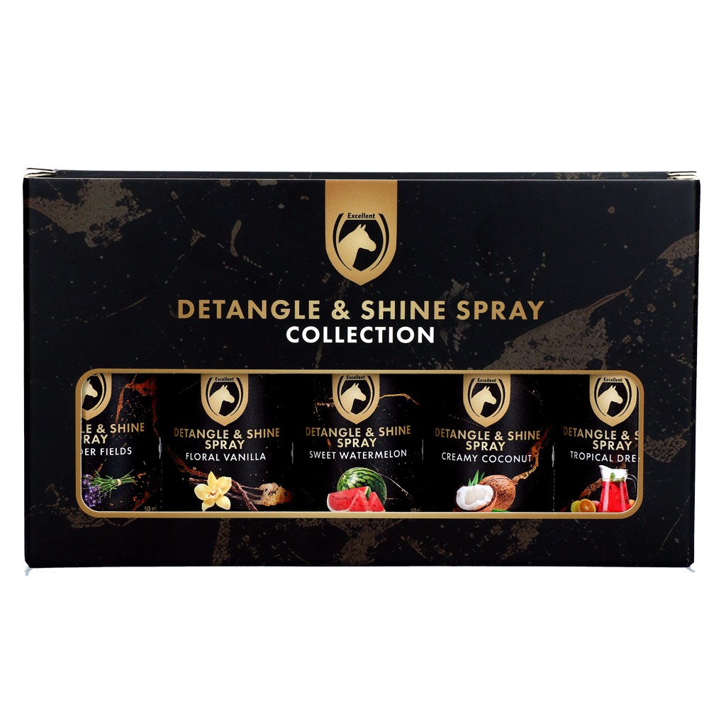 De Excellent Horse Detangle & Shine Spray geschenkset bevat vijf sprays van 50 ml in verschillende geuren: Creamy Coconut, Floral Vanilla, Sweet Watermelon, Lavender Fields en Tropical Cocktail. Elke spray verzorgt manen en staart, maakt het haar soepel doorkambaar en geeft een natuurlijke glans. De lichte formule droogt snel en laat geen vettig of plakkerig laagje achter, waardoor het haar goed handelbaar blijft.