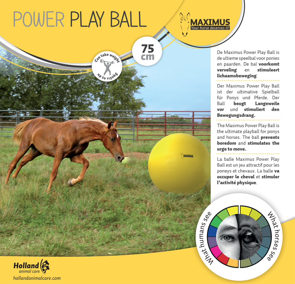 Dat paarden kleuren zien is zeker. „Paarden hebben echter maar twee types kegeltjes en hun kleurzicht is vergelijkbaar met een kleurenblind persoon: zij zien blauw, geel, wit en grauw, maar kunnen groen en rood slecht van elkaar onderscheiden.” Daarom is de Maximus Power Play Ball de ideale speelbal voor uw paard.