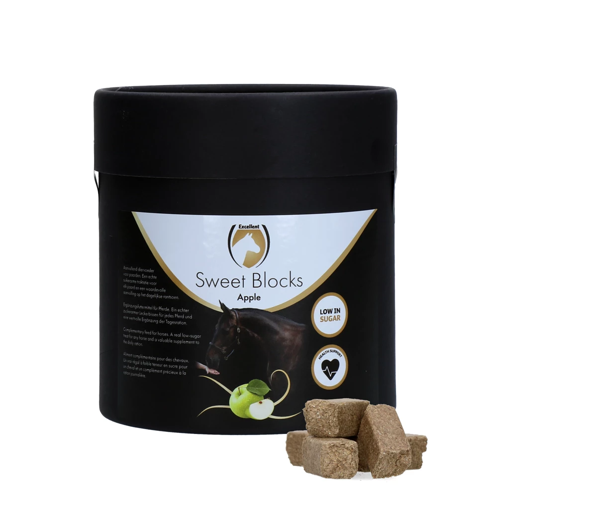 De Excellent Horse Sweet Blocks zijn een suikerarme en smakelijke traktatie voor paarden. Ze vormen de ideale, 'niet-dikmakende' beloning voor paarden en zijn tegelijkertijd een waardevolle aanvulling op het dagelijkse rantsoen en ondersteunen de algehele gezondheid van paarden. De Sweet Blocks zijn eenvoudig los mee te nemen in de tas of zak doordat ze niet kruimelen of plakken.