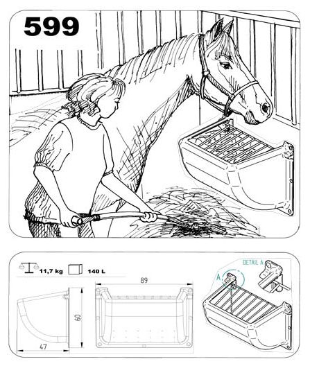 De vorm en de plaatsing van deze voederbak houden rekening met de natuurlijke eetpositie van een paard. Stof etc. zal via de brede gaten aan de onderkant verdwijnen waardoor een paard minder last zal hebben van zijn luchtwegen.