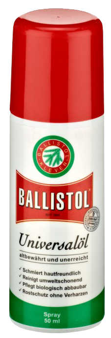 Ballistol Universeel Olie Spray verzorgt, beschermt en smeert alle materialen bestaande uit metaal, kunststof, rubber, leder en hout. Reinigt, smeert, conserveert en beschermt tegen corrosie en roest. Verhardt niet, lost vetten, teer, smeer en lijmresten op.