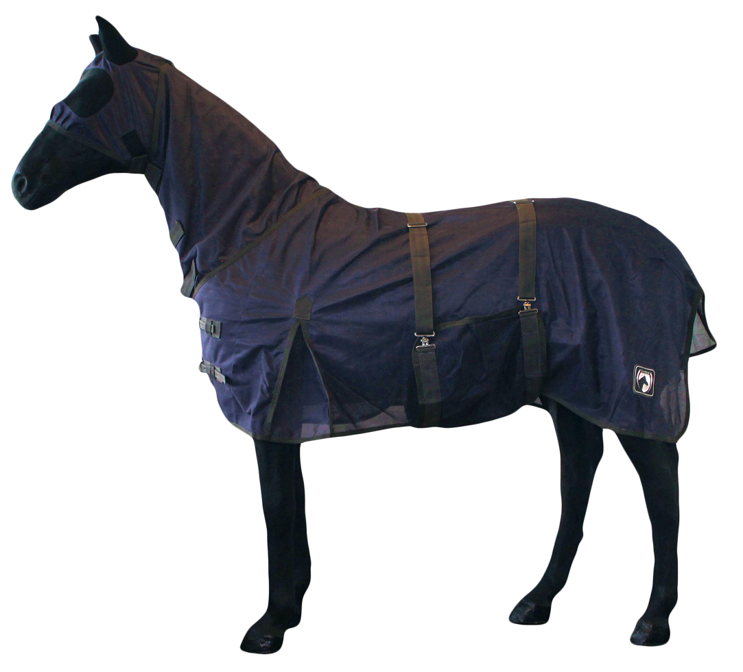 Robuuste vliegendeken die een optimale bescherming biedt tegen vliegen. Bescherming voor het hele lichaam (hoofd, nek, buik, enz). De borstriem met nek aan hoofdverbinding zijn voorzien van stevige klittebandsluiting.